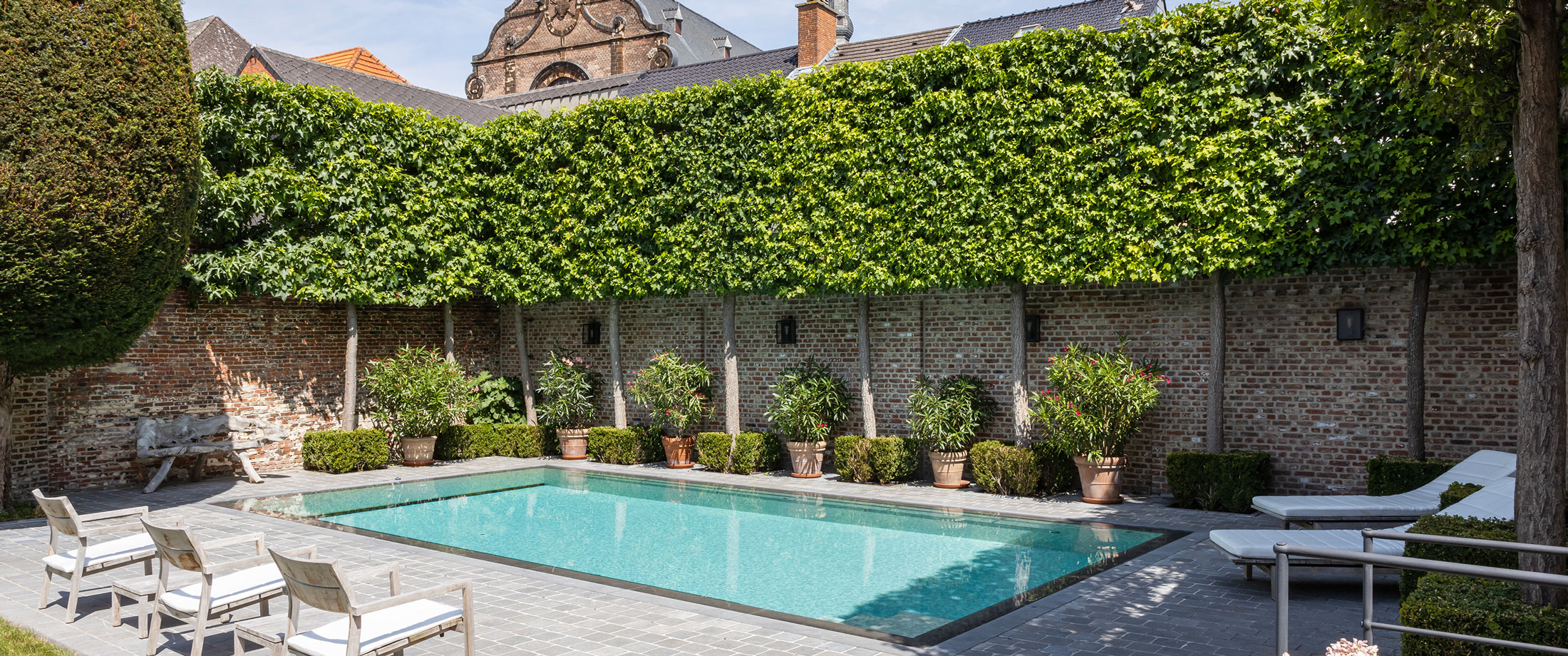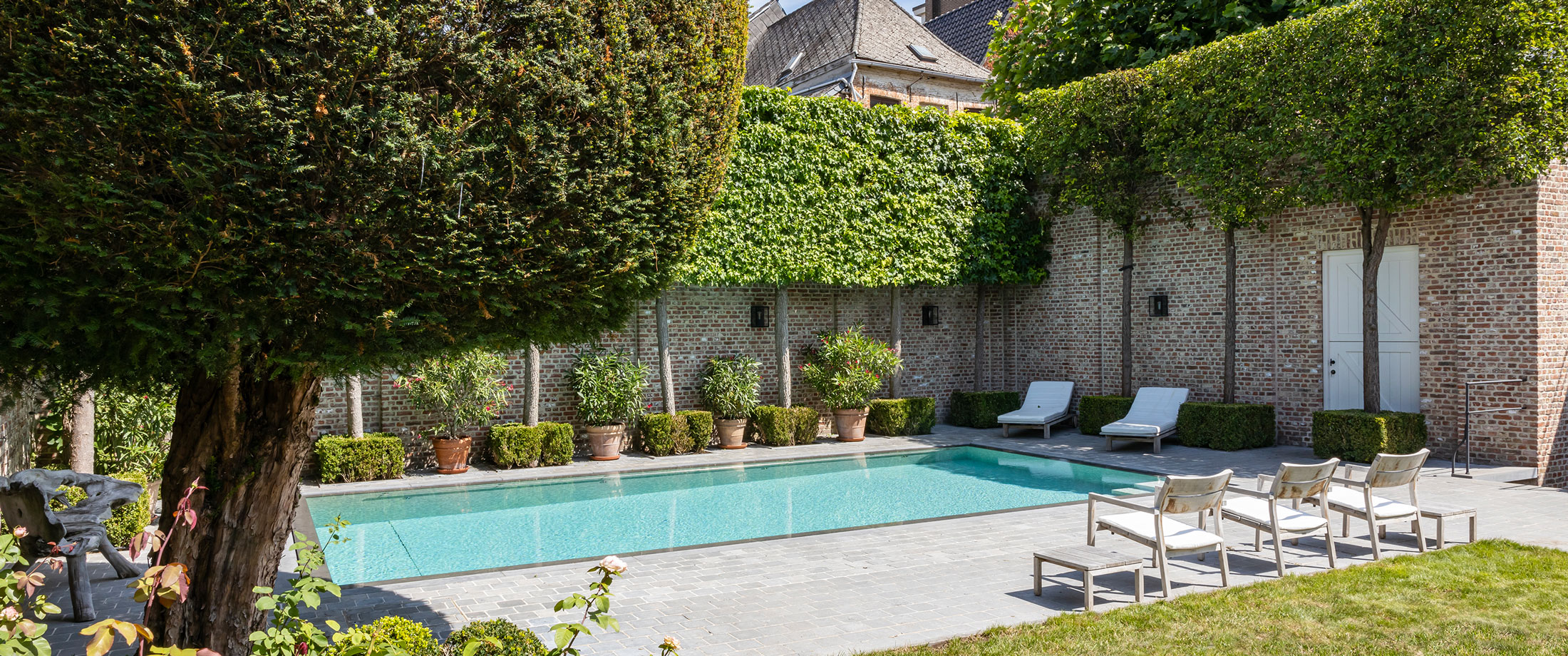 Hier maakt de drukte van de stad plaats voor stilte en groen. Het gerenoveerde zwembad vormt het middelpunt van de buitenruimte en brengt rust en harmonie in het geheel.