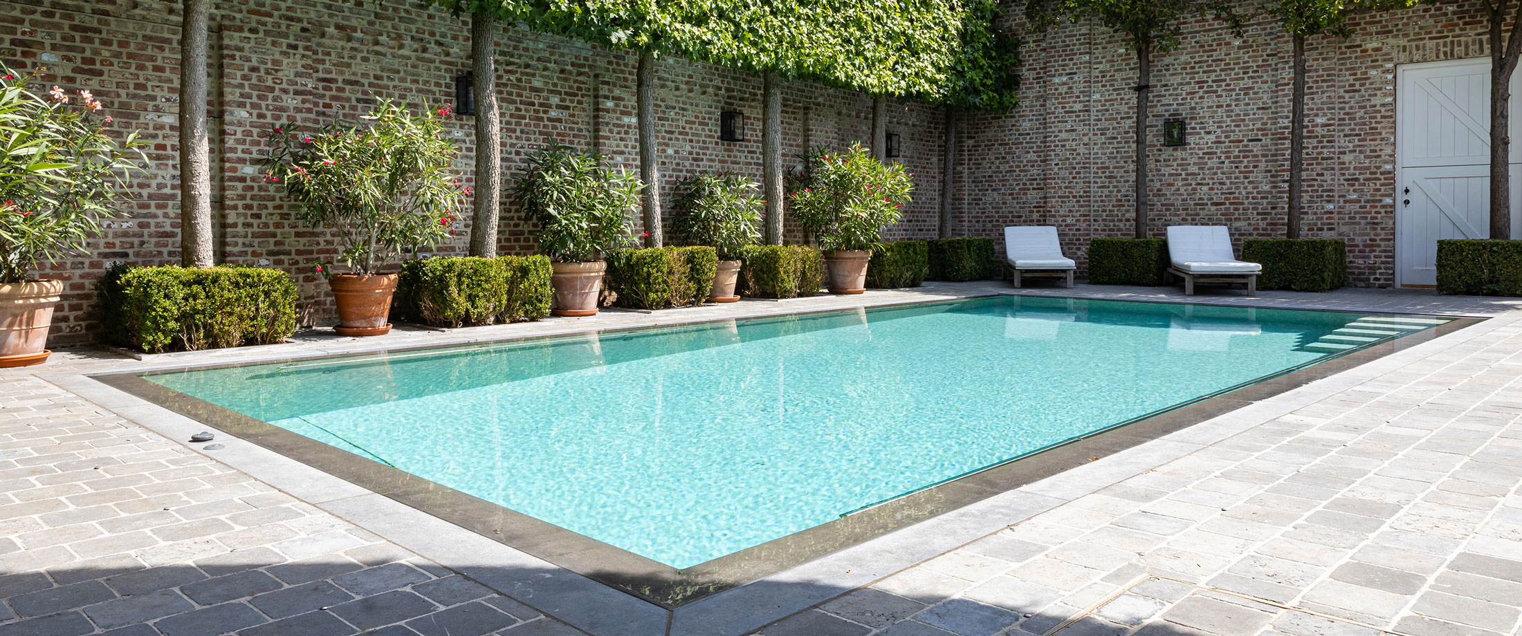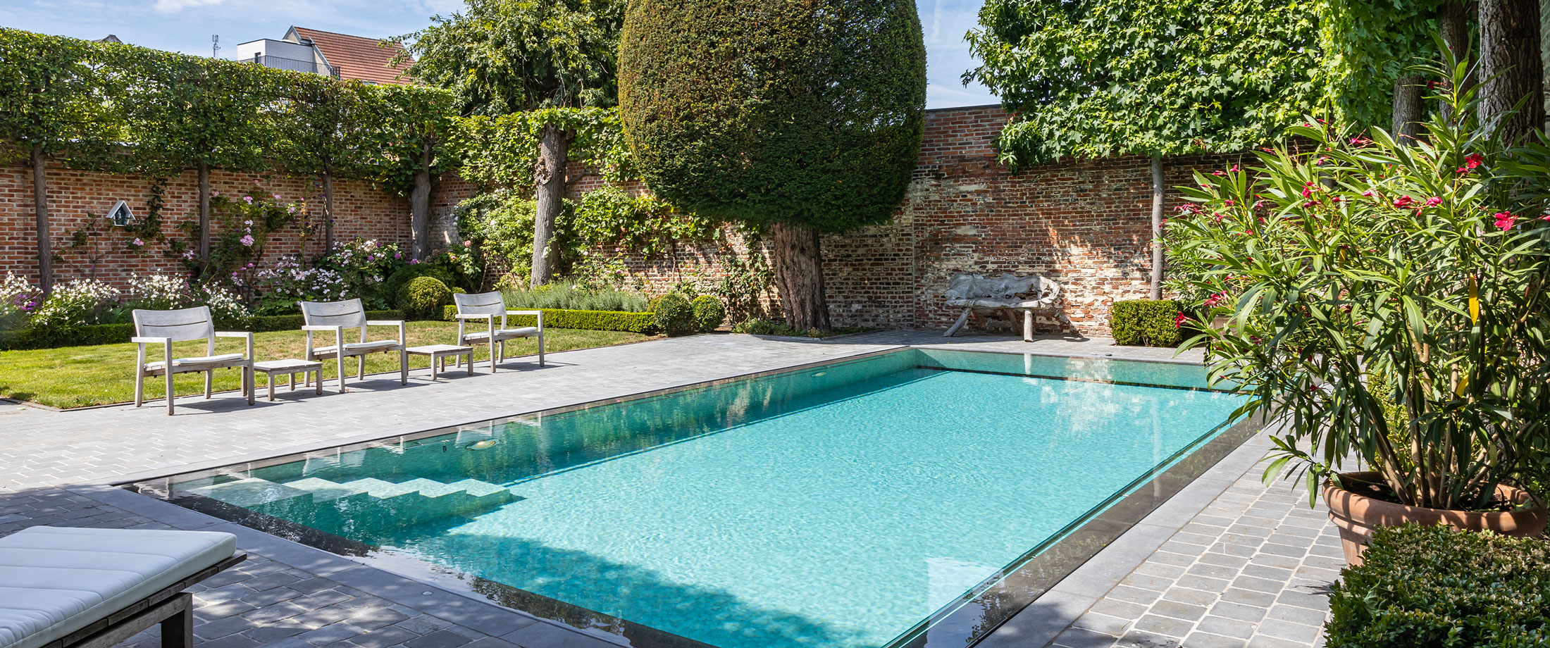 Met zijn compacte afmeting van 8 x 4 meter past het perfect in de intieme tuin. De mozaïektegels in Bisazza Budapest geven het water een zachte, en zelfs lichtgevende uitstraling. Zonlicht danst over het oppervlak en weerkaatst tegen de warme bakstenen muur. Een vakantiegevoel in eigen land.