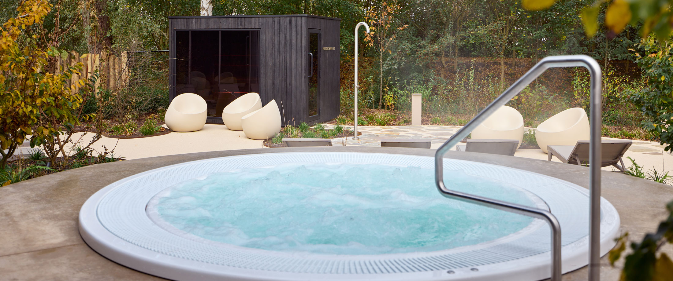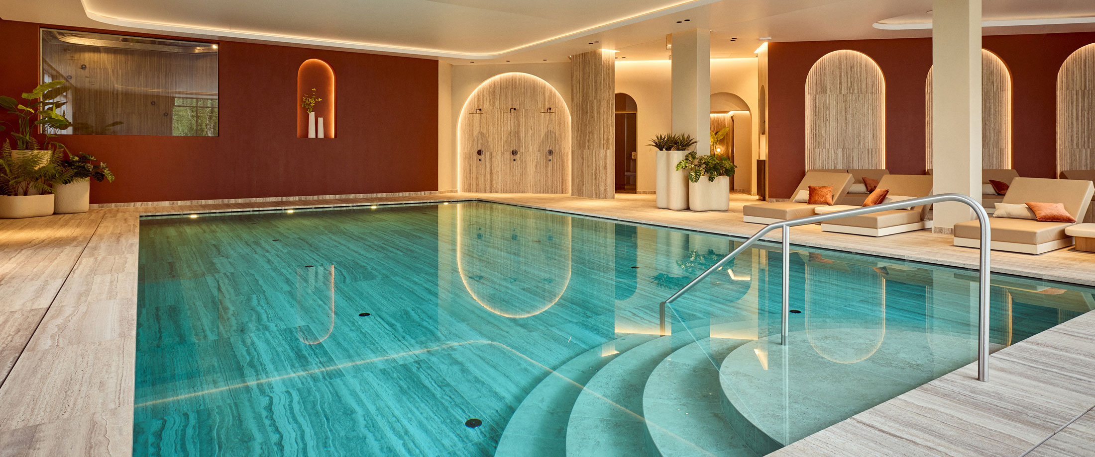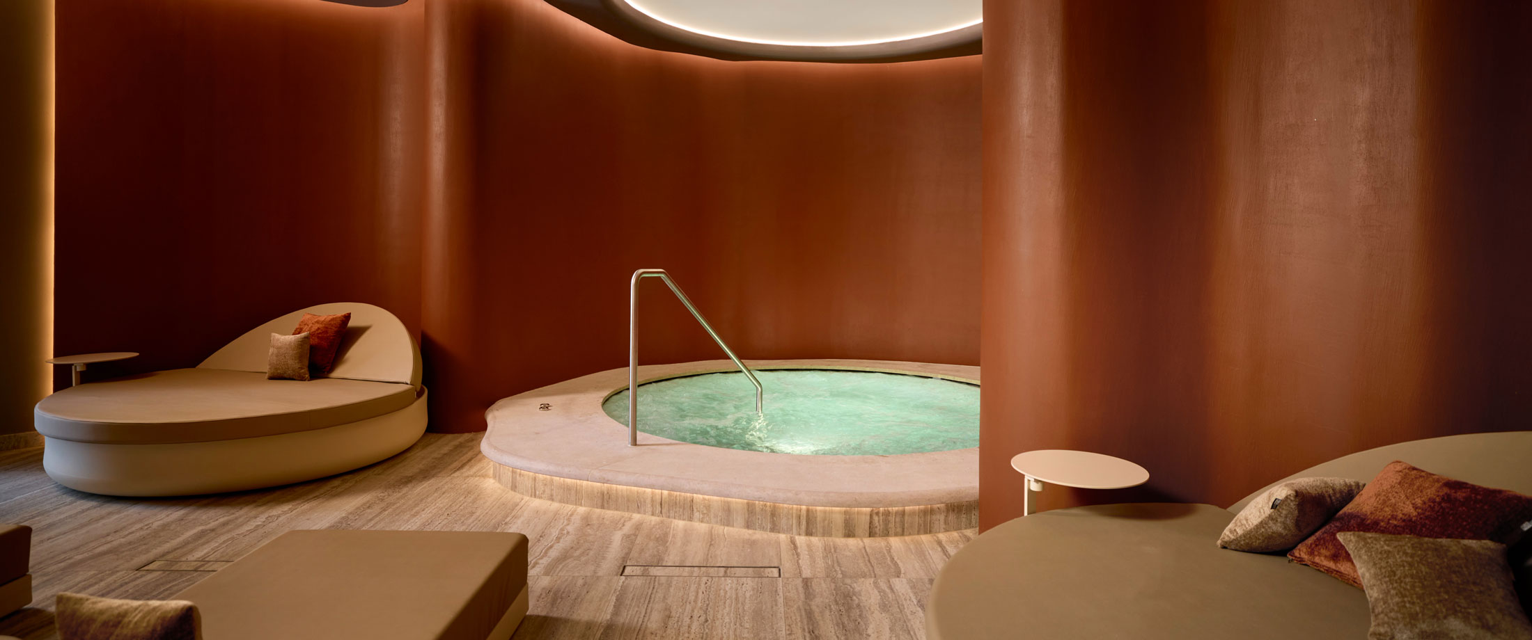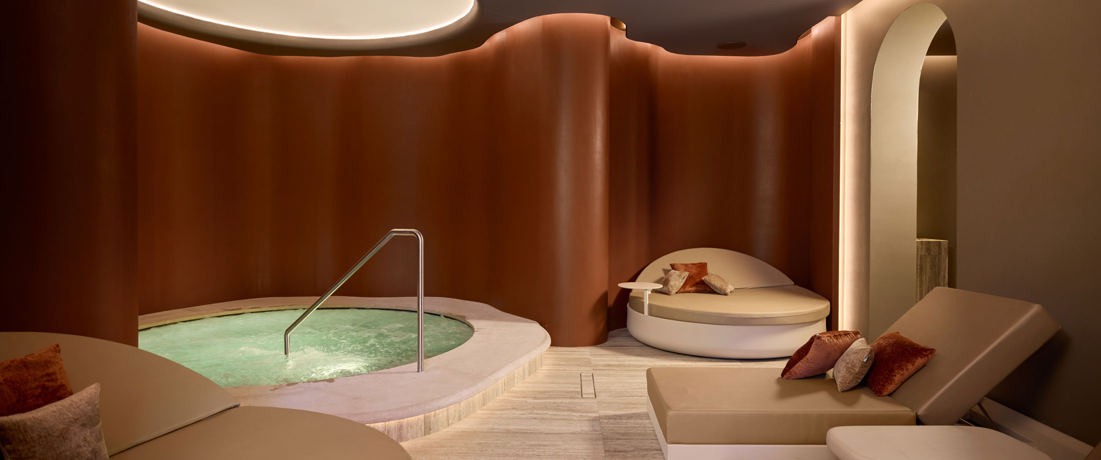 De op maat gemaakte whirlpool in Bisazza-mozaïek nodigt uit tot pure ontspanning, met vloeiende vormen en een omhullend comfort. Een voetenbad, koud dompelbad en buitenspa versterken de wellnessbeleving. Achter de schermen zorgt een volautomatische, energiezuinige installatie voor een duurzame en feilloze werking.