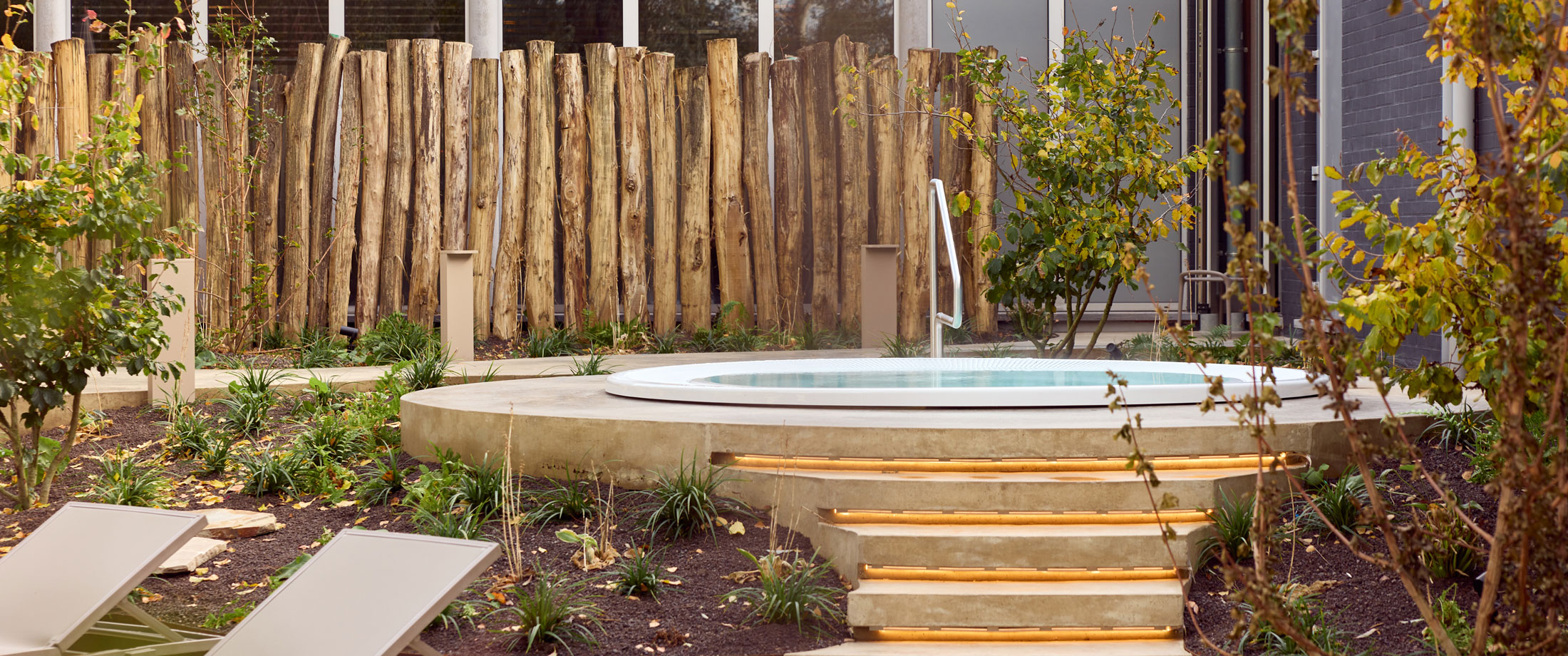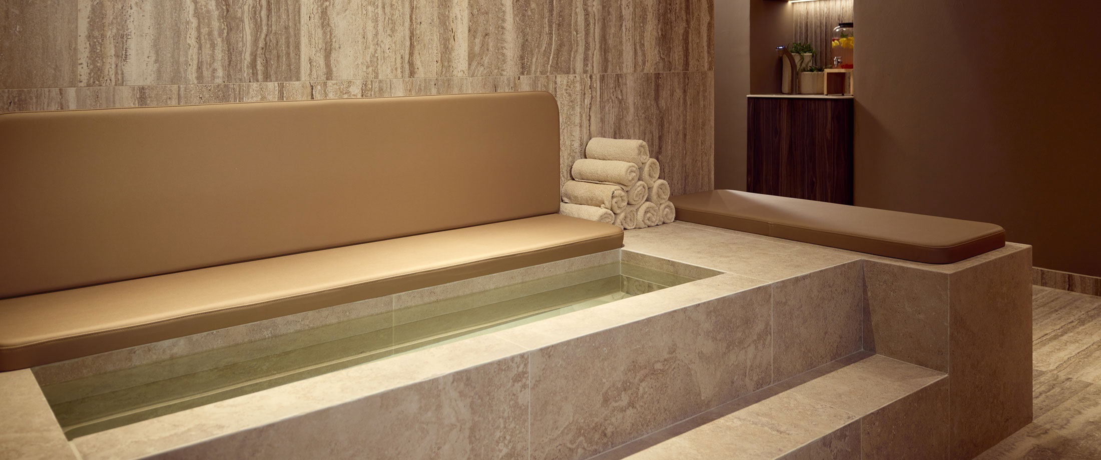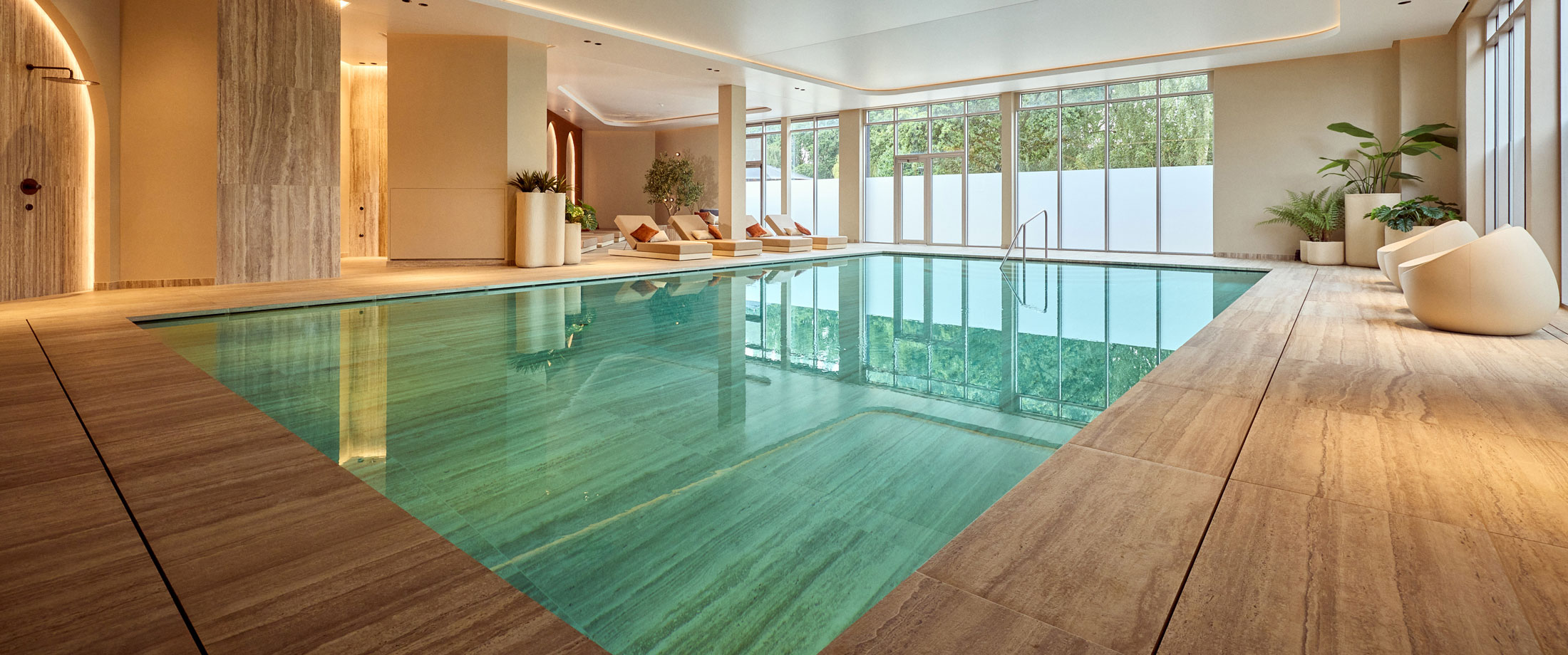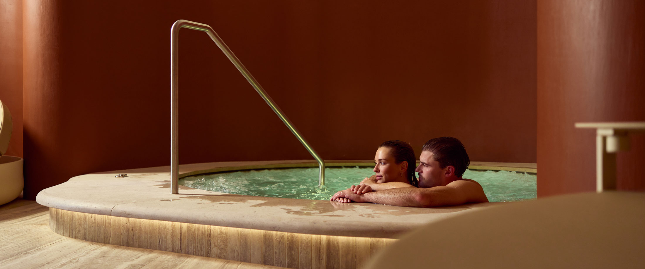 De op maat gemaakte whirlpool in Bisazza-mozaïek nodigt uit tot pure ontspanning, met vloeiende vormen en een omhullend comfort. Een voetenbad, koud dompelbad en buitenspa versterken de wellnessbeleving. Achter de schermen zorgt een volautomatische, energiezuinige installatie voor een duurzame en feilloze werking.